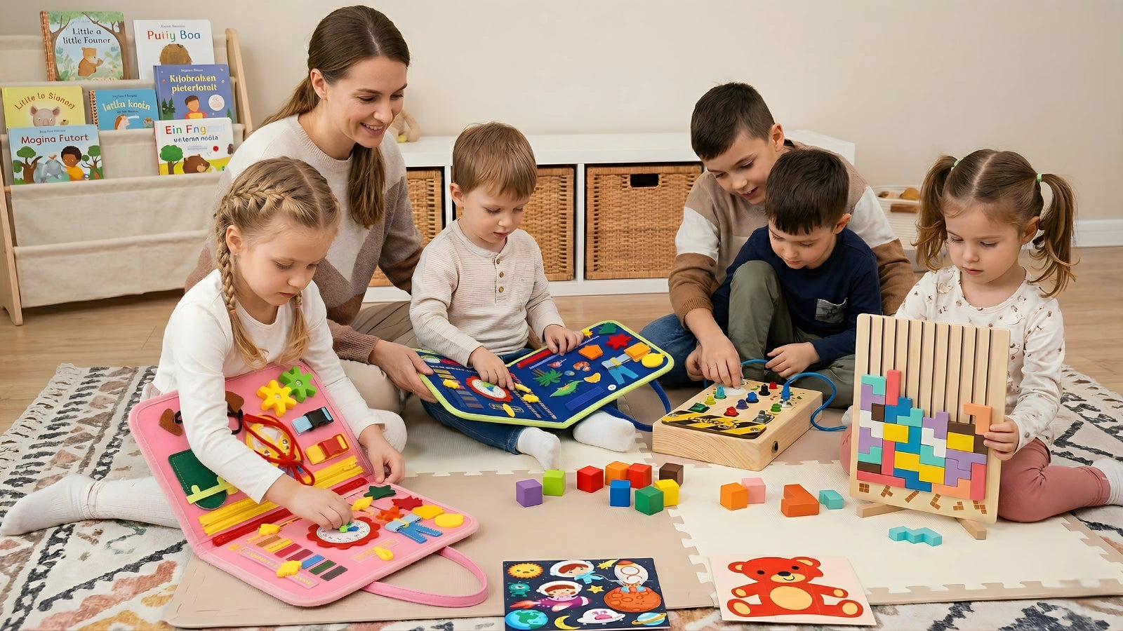 Gondosan válogatott Montessori-alapú fejlesztő játékok, tartós és biztonságos anyagokból.